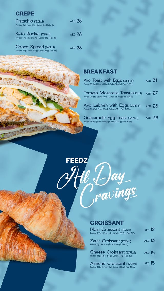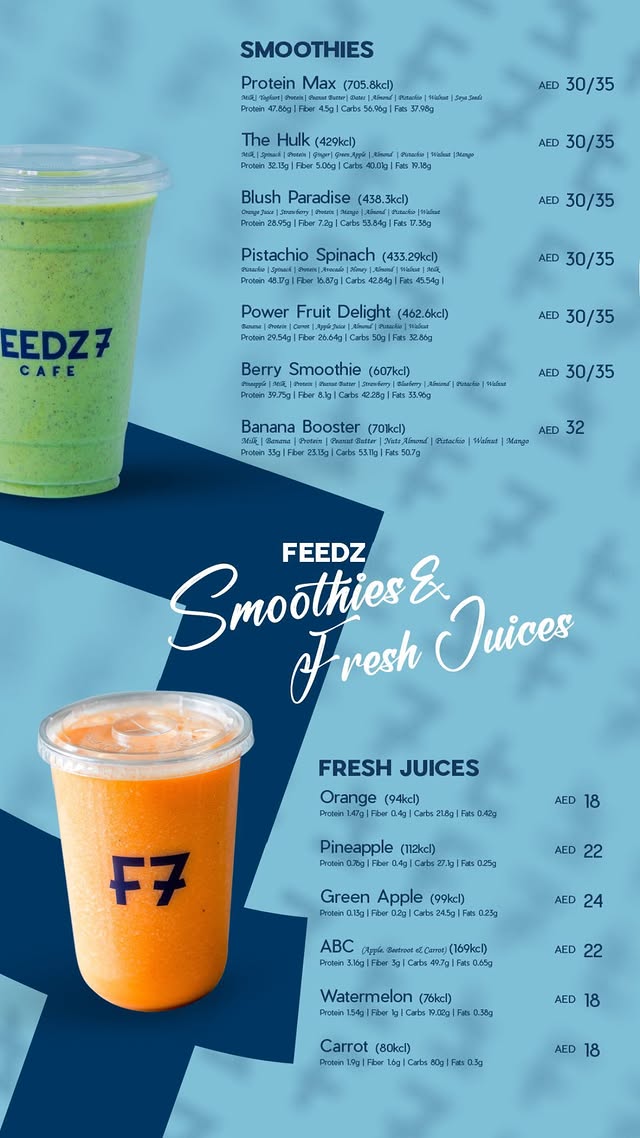 The menu at Feedz 7 Cafe - Mubadala Arena offers a variety of food and drink options suitable for different times of the day, including breakfast, coffee breaks, and light meals. Although detailed menu items are not provided, the offerings generally include beverages such as coffee and other drinks alongside light food items and snacks. This setup allows for quick orders as well as casual dining experiences.